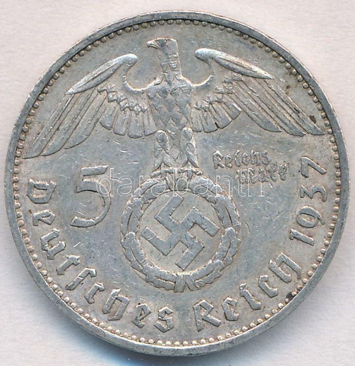 Germ... https://www.darabanth.com/hu/308-Gyorsarveres/308.0/Numizmatika/Kulfoldi-fem-es-ezustpenzek~300013/Nemet-Harmadik-Birodalom-1937E-5M-Ag-Hindenburg-T2---German-Third-Reich-1937E-5-Mark-Ag-Hindenb~II1670765