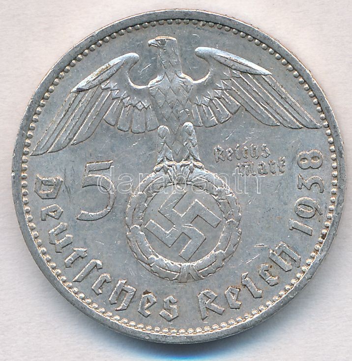 Germ... https://www.darabanth.com/hu/308-Gyorsarveres/308.0/Numizmatika/Kulfoldi-fem-es-ezustpenzek~300013/Nemet-Harmadik-Birodalom-1938A-5M-Ag-Hindenburg-T2---German-Third-Reich-1938A-5-Mark-Ag-Hindenb~II1670753