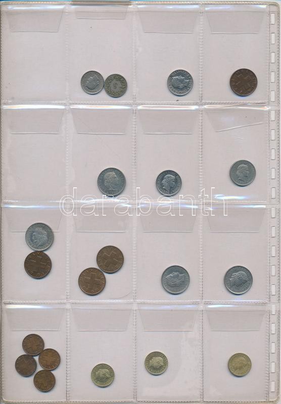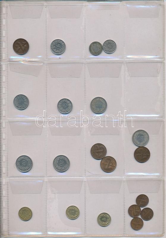 Mixed: San Marino 1975. 50 Lire Steel (2x) + 100 Lire Steel (2x) + Svájc 1958-1971. 1 Rappen Br (4x) + 1948-1974. 2 Rappen Br (8x) + 1955-1979. 5 Rappen Cu-Ni (2x) + 1983-1987. 5 Rappen Al-sárgaréz (3x) + 1977-1988. 10 Rappen Cu-Ni (3x) + 1971-1985. 20 Rappen Cu-Ni (4x) all on binder page C:XF,VF