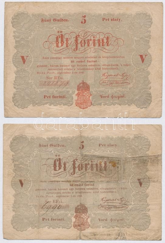 Leírás: 1848. 5Ft "Kossuth bankó" (2x) egyik vörösesbarna, másik barna nyomat T:III,III-