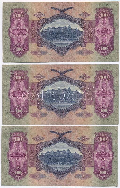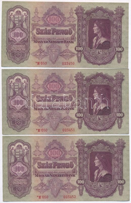 1930. 100P (3x) sorszámkövetők, csillagos sorozatszám T:I https://www.darabanth.com/hu/308-Gyorsarveres/308.0/Numizmatika/Magyar-bankjegyek~300007/1930-100P-3x-sorszamkovetok-csillagos-sorozatszam-TI~II1671002
