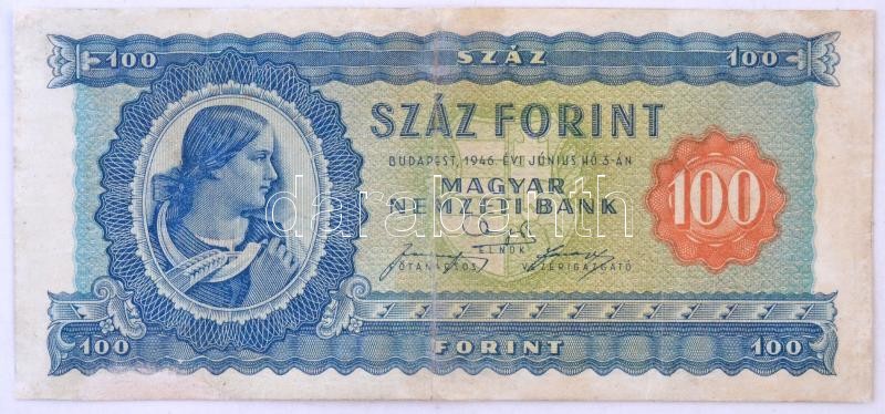 Hungary 1946. 100 Forint C:F,VG res... https://www.darabanth.com/hu/308-Gyorsarveres/308.0/Numizmatika/Magyar-bankjegyek~300007/1946-100Ft-TIII-III-restauralt--Hungary-1946-100-Forint-CF-VG-restored--Adamo-F26~II1675586