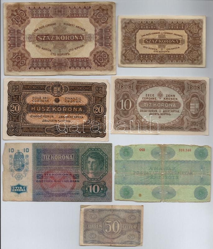 Leírás: Vegyes korona tétel 7xklf bankjegy 1915-1923 közötti időszakból T:II-IV