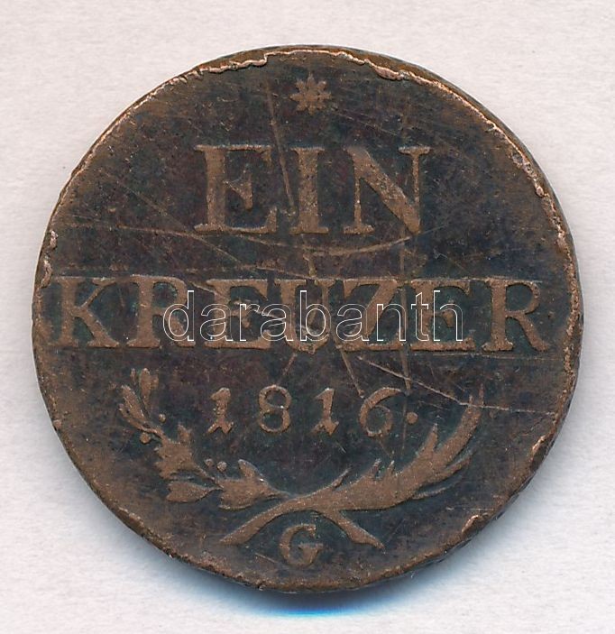 Huszár: 2060., Unger III... https://www.darabanth.com/hu/308-Gyorsarveres/308.0/Numizmatika/Magyar-es-magyar-verdejelu-fem-es-ezustpenzek~300008/1816G-1kr-Cu-I-Ferenc-T2-karc--Huszar-2060-Unger-III-1406c~II1638019
