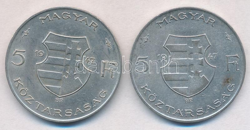 1947. 5Ft Ag "Kossuth" (2x) T:2,2- https://www.darabanth.com/hu/308-Gyorsarveres/308.0/Numizmatika/Magyar-es-magyar-verdejelu-fem-es-ezustpenzek~300008/1947-5Ft-Ag-Kossuth-2x-T2-2-~II1671562