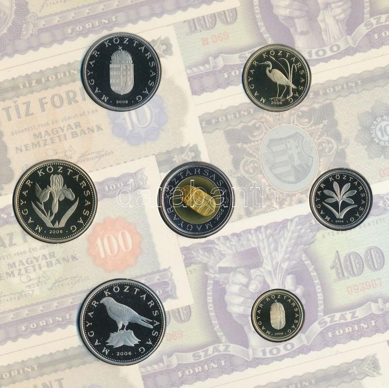 Leírás: 2006. 1Ft-100Ft (8xklf) forgalmi sor szettben, benne 1946-os 1Ft Ag "Hatvanéves a Forint" T:PP halvány patina