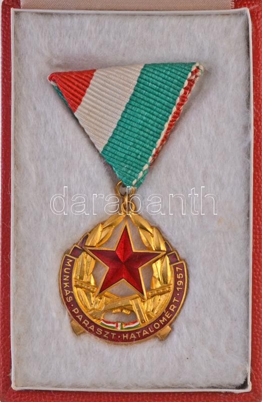 Leírás: 1957. "Munkás-Paraszt Hatalomért Emlékérem" aranyozott, zománcozott Br kitüntetés mellszalagon, eredeti dísztokban T:1-