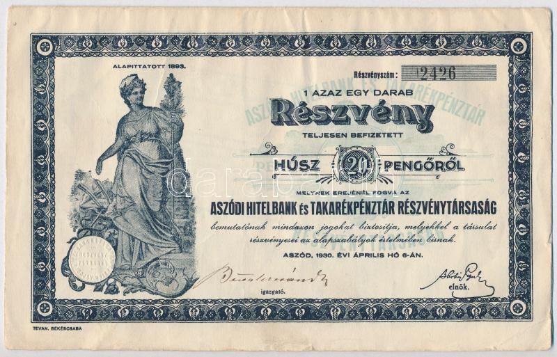 Leírás: Aszód 1930. "Aszódi Hitelbank és Takarékpénztár Részvénytársaság" részvénye 20P-ről, szárazpecséttel és szelvényekkel T:III