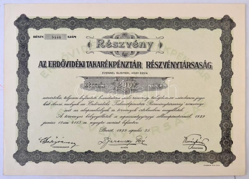 Barót 1929. "Az Erdővidéki Takarékpénztár Részvénytársaság" ... https://www.darabanth.com/hu/308-Gyorsarveres/308.0/Numizmatika/Reszvenyek-es-sorsjegyek~300005/Barot-1929-Az-Erdovideki-Takarekpenztar-Reszvenytarsasag-reszvenye-200L-rol-TI-~II1669244