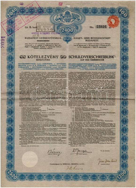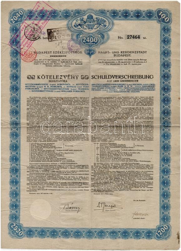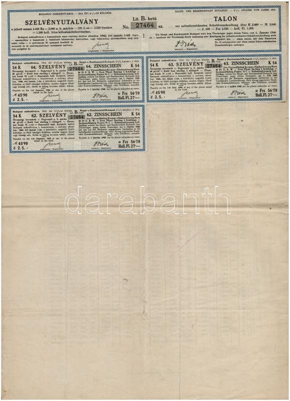 Budapest 1914. "Budapest Székesfőváros - Kötelezvény" 2400K-... https://www.darabanth.com/hu/308-Gyorsarveres/308.0/Numizmatika/Reszvenyek-es-sorsjegyek~300005/Budapest-1914-Budapest-Szekesfovaros-Kotelezveny-2400K-rol-szelvenyekkel-2x-plus-1941-4~II1677468