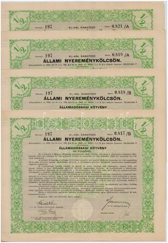 Leírás: Budapest 1914. "Budapest Székesfőváros - Kötelezvény" 2400K-ról szelvényekkel (2x) + 1941. "4%-kal kamatozó állami nyereménykölcsön" államadóssági kötvény 1/2 részkötvénye 100P-ről (4x) mind szelvényekkel, szárazpecséttel. Három sorszámkövető, a negyedik egyugrásos sorszámkövető T:II,III