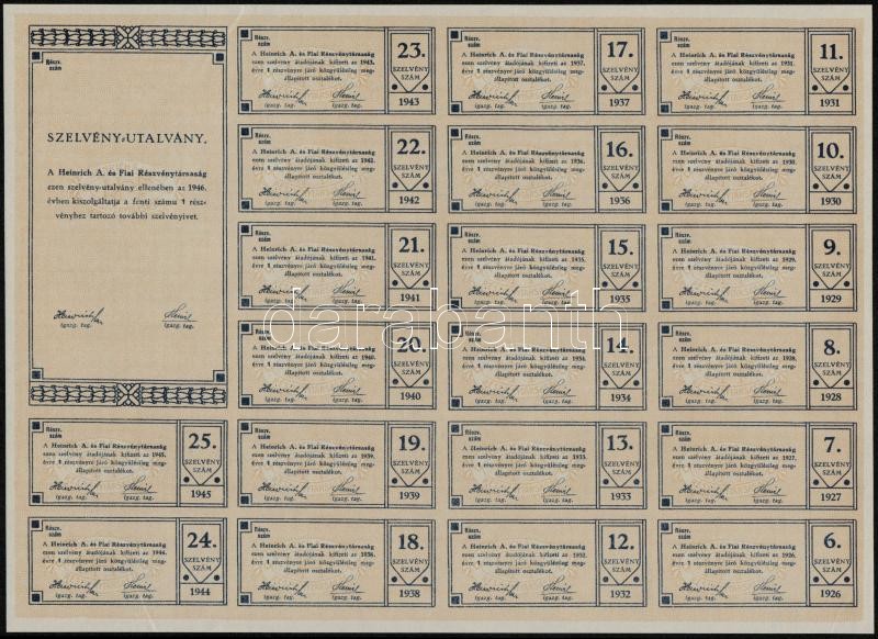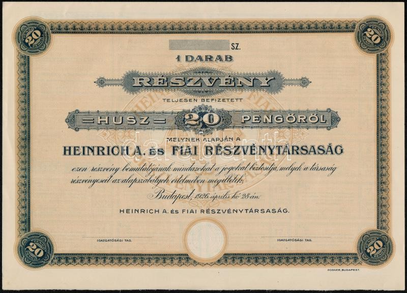 Leírás: Budapest 1926. "Heinrich A. és Fiai Részvénytársaság" részvénye 20P-ről, szárazpecséttel, sorszám és aláírások nélkül, teljes szelvényívvel T:1-