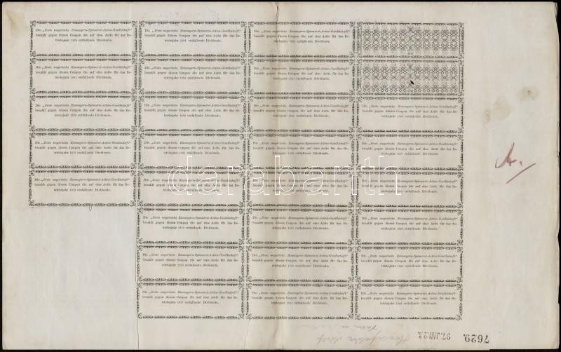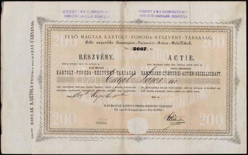 Budapest / Pest 1869. "Első Magyar Kártoly-Fonoda-Részvény-Társaság" névre szóló részvénye 200Ft-ról, magyar és német nyelven, szárazpecséttel, szelvényekkel T:III ly.
