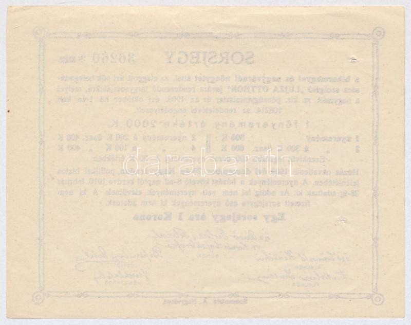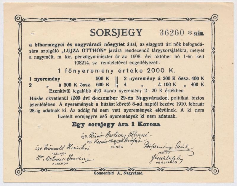 Nagyvárad 1908. "A biharmegyei és nagyváradi nőegylet által, az elaggott úri nők befogadására szolgáló "LUJZA OTTHON" javra rendezendő tárgysorsjátékra" sorsjegy 1K értékben T:I- tűly.