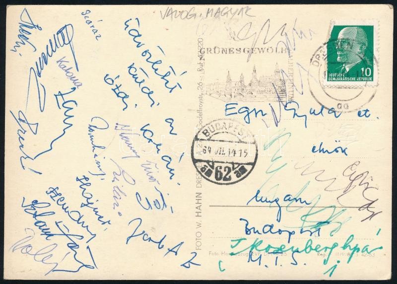 Az Ózdi Kohász labdarúgócsapat tagjai által aláírt képeslap Drázdából. (Kemény, Katona, Hajner, Széraz, Szilasi...) / Autograph signed postcard of Hungarian football team.