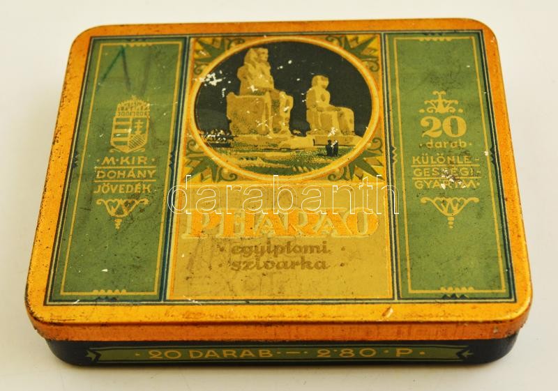 Pharao egyiptomi szivarka fém doboza, kopásnyomokkal, 9x7,5x2 cm https://www.darabanth.com/hu/309-Gyorsarveres/309.0/Festmeny-mutargy-papirregiseg-egyeb/Bolhapiac~11/Pharao-egyiptomi-szivarka-fem-doboza-kopasnyomokkal-9x7-5x2-cm~II1683141