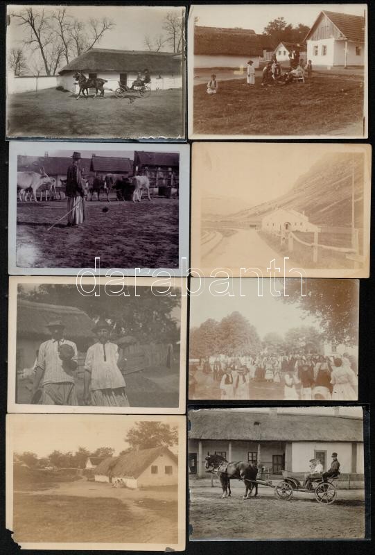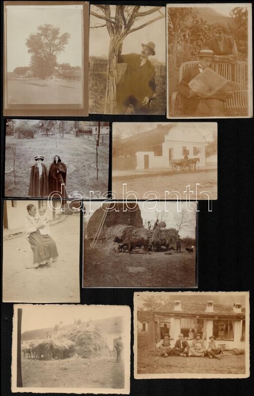 cca 1910 Jómódú család vidéki birtokán készült 17 db vintage fénykép különféle témákról (hintó, falusi ünnep, állattartás, ökrös szekér, napszámosok, stb.), 10x8 cm és 12x9 cm