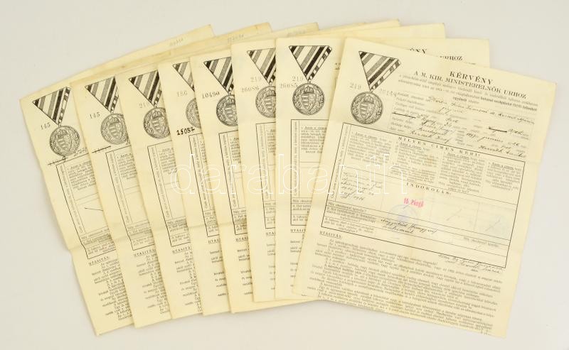 1930 Kérvény a M. Kir. Ministerelnökhöz a piros-fehér-zöld szegélyű szalagon viselendő kard- és sisaknélküli háborus emlékérem adományozása iránt az 1914-1918. évi háborúban katonai szolgálatot nem teljesített egyének részére, Bethlen István (1874-1946) miniszterelnökhöz (1921-1931), 9 db, közte Sárosi Várady Ferenc (1860-1945) író, költő, újságíró, levéltáros, és Felsőszopori Dr. Tóth Jenő ny. államtitkár kérelmei, számos pecséttel, aláírással, közte a vitézi székkapitányok és Ripka Ferenc (1871-1944) főpolgármester aláírásaival, fejléces papíron