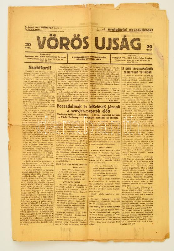 1919 a Vörös újság 2. évf. 46. lapszáma (ápr. 3.), számos érdekes aktuális hírrel (szovjet csapatok előrenyomulása, "cseh burzsoákatonák rémuralma Tótföldön", stb.)