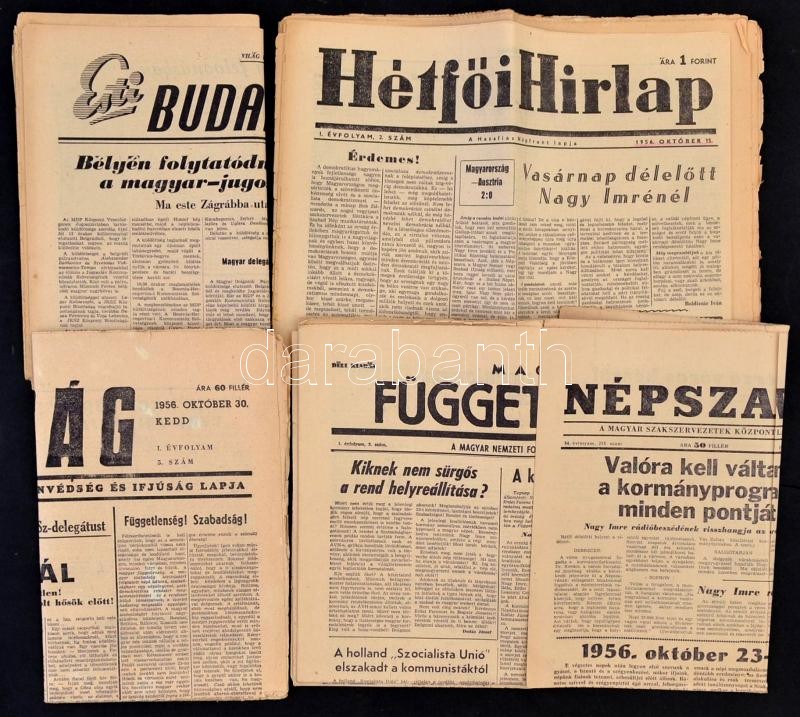 1956 Vegyes 1956-os folyóirat tétel, 13 db: Népszabadság, 84. évf. 255. sz., 1956. október 29. Magyar függetlenség, I évf. 3-5. sz., 1956. október 31.-november 3. Igazság. I. évf. 5.,7-8. sz., 1956. október 30., november 1-2. Hétfői Hirlap I. évf. 2-4 sz., 1956. október 15.,22.,29. Esti Budapest. V. évf. 246.,249-250. sz. 1956. október 18.,22-23.