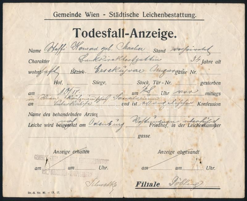Leírás: 1920 Döbling, szanatóriumi halotti igazolás soproni elhunyt részére, hátulján magyar hatósági igazolásokkal a határon való áthozatalról