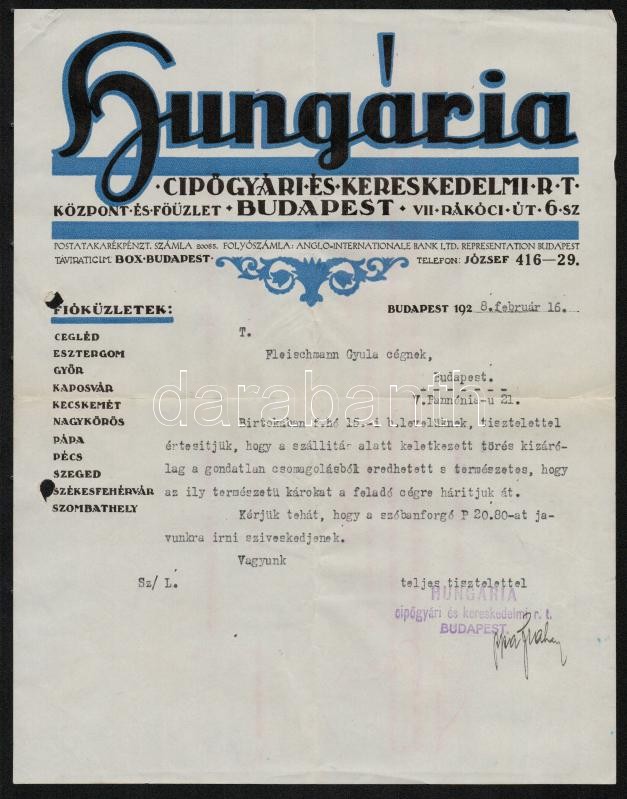 1928 Hungária Cipőgyári és Kereskedelmi Rt. díszes fejléces levél, 29x... https://www.darabanth.com/hu/309-Gyorsarveres/309.0/Festmeny-mutargy-papirregiseg-egyeb/Okmanyok~16/1928-Hungaria-Cipogyari-es-Kereskedelmi-Rt-diszes-fejleces-level-29x22-5-cm~II1683191