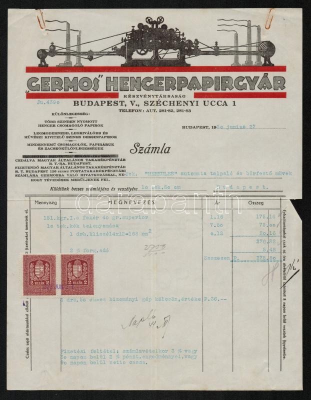 Leírás: 1930 Germos Hengerpapírgyár Rt., díszes fejléces számla, okmánybélyegekkel, 29,5x23 cm