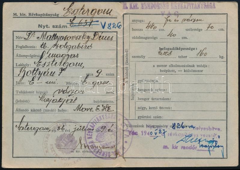 1936 Esztergom, A M. kir. Révkapitányság által kiállított kajakbejelen... https://www.darabanth.com/hu/309-Gyorsarveres/309.0/Festmeny-mutargy-papirregiseg-egyeb/Okmanyok~16/1936-Esztergom-A-M-kir-Revkapitanysag-altal-kiallitott-kajakbejelento-igazolvany~II1686199