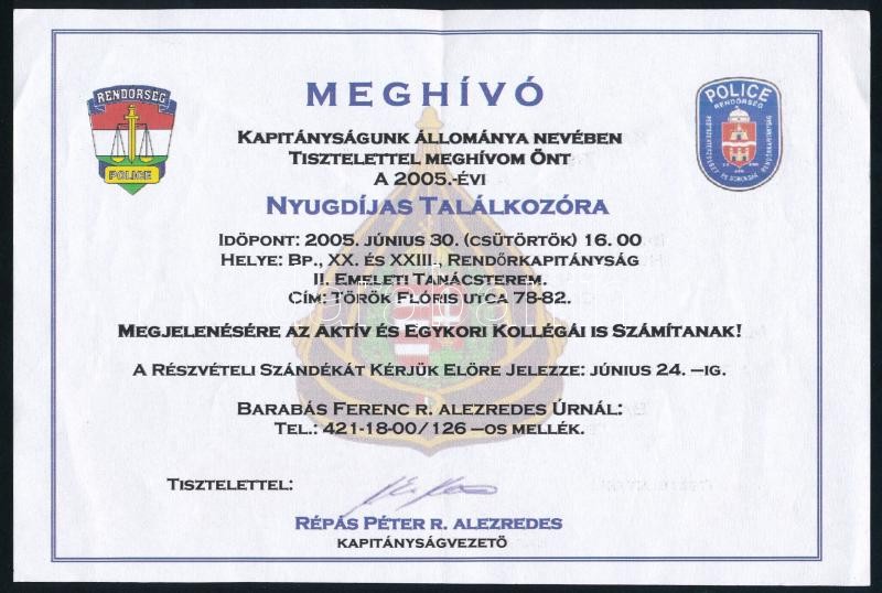 Leírás: 1966, 2005 A Rendőrtiszti Akadémia által kiállított oklevél + meghívó nyugdíjas találkozóra