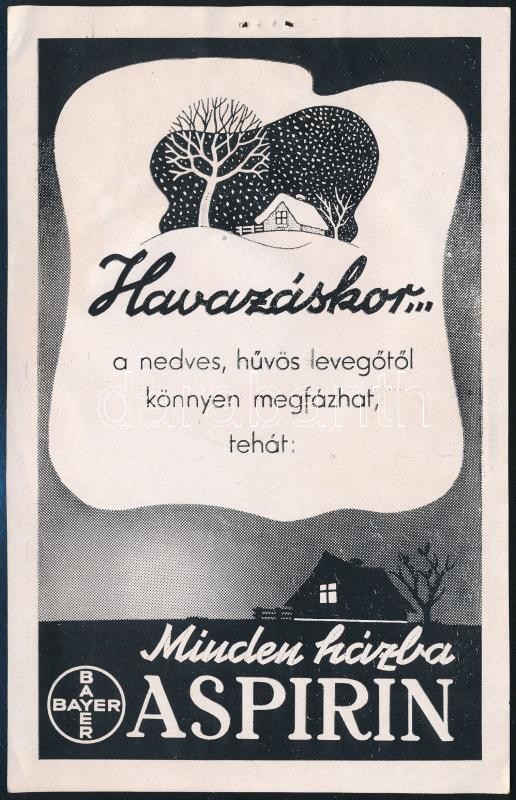 Leírás: "Havazáskor... minden házba Aspirin" - reklámos szórólap, két apró tűzésnyommal, 19,5x12,5 cm