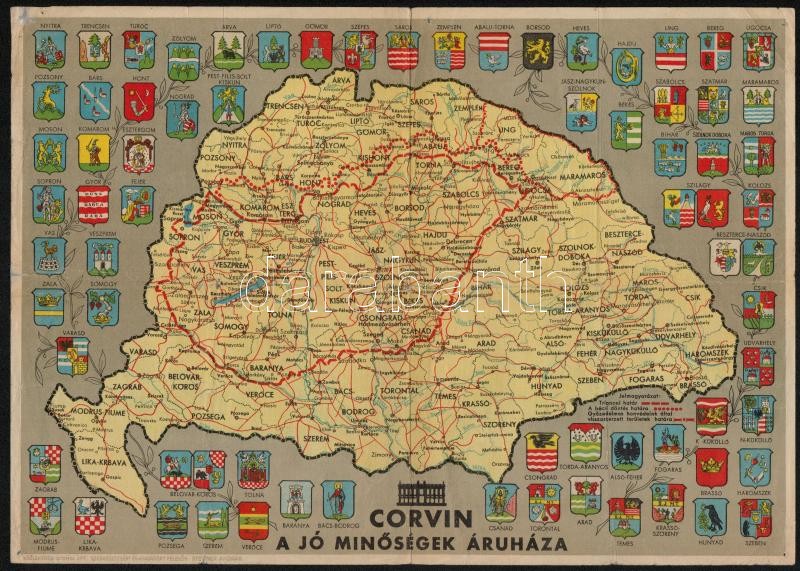 cca 1941 Corvin áruház reklámos térkép a vármegyék címereivel, hátolda... https://www.darabanth.com/hu/309-Gyorsarveres/309.0/Festmeny-mutargy-papirregiseg-egyeb/Reklam~19/cca-1941-Corvin-aruhaz-reklamos-terkep-a-varmegyek-cimereivel-hatoldalan-orarend-24x33-~II1678220