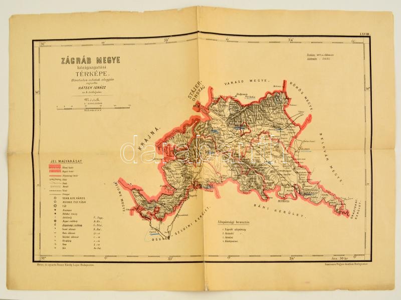 Leírás: 1880 Zágráb megye közigazgatási térképe. Hátsek Ignácz atlaszából. Kiadta Rautmann Frigyes. 1:500000, hajtás mentén ragasztott, 54x38 cm