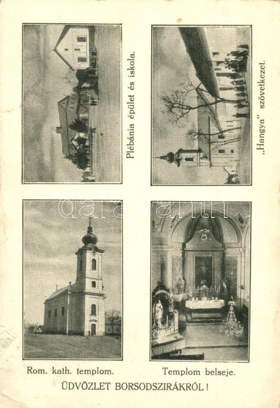 Leírás: Borsodszirák, Római katolikus templom belső, Plébánia épület és iskola, Hangya szövetkezet üzlete. Szilágyi Arthur kiadása (gyűrődés / crease)