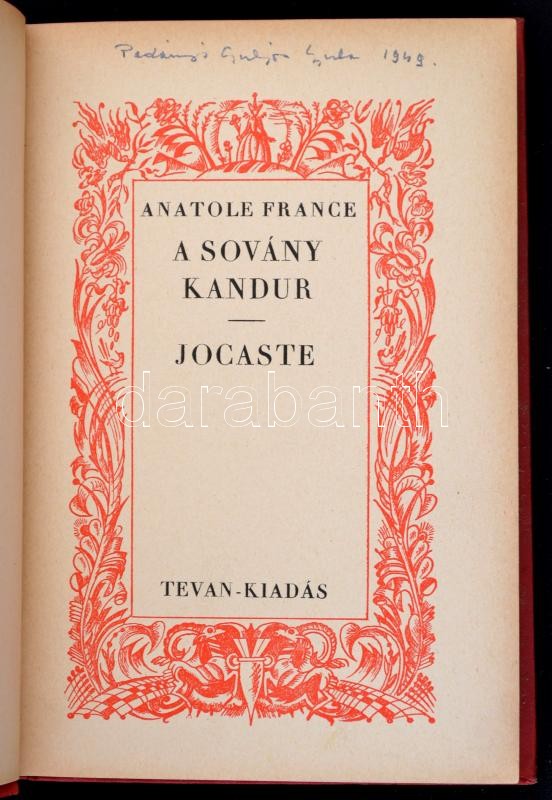Anatole France: A sovány kandúr. Jocaste. Békéscsaba, é.n., Tevan. Kiadói dúsan aranyozott egészvászon-kötés. Padányi Gulyás Gábor ex libris pecsétjével ex libris pecsétjével és Padányi Gulyás Gyula tulajdonosi névbejegyzésével, dátumozással.