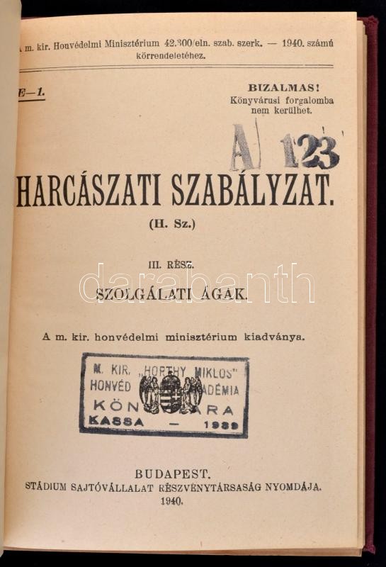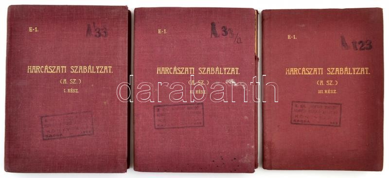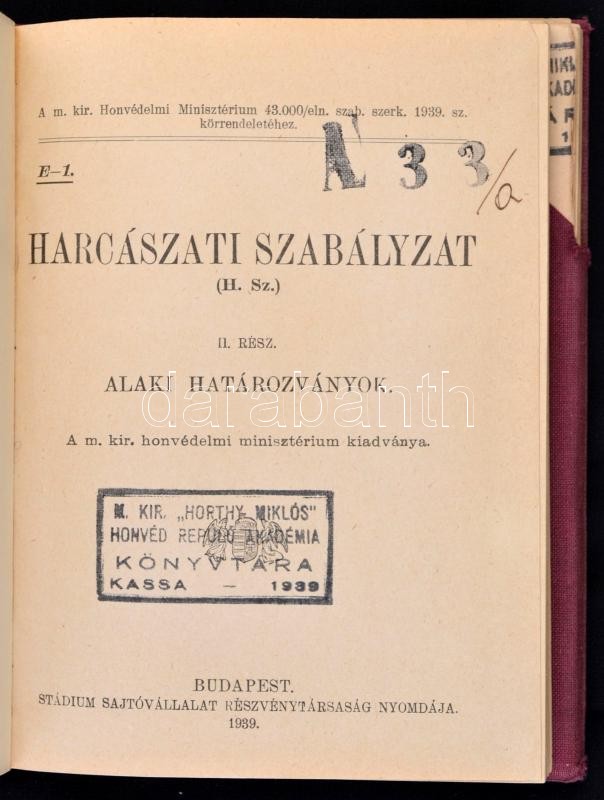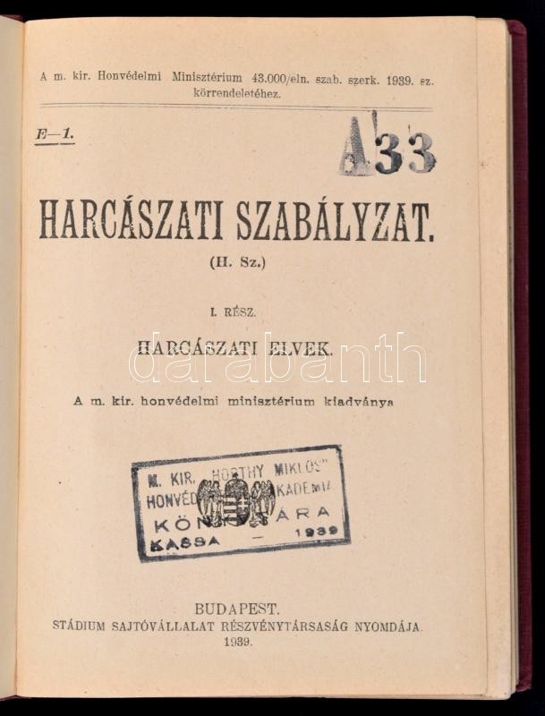 Harcászati szabályzat I-III. Bp., 1939. Stádium. A M. kir. Horthy Miklós honvéd repülő akadémia, Kassa bélyegzőjével. Egészvászon kötésben, jó állapotban.