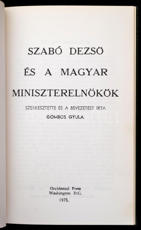 Szabó Dezső és a magyar miniszterelnökök. Szerkesztette és a bevezetést írta: Gombos Gyula. Washington D.C.,1975, Occidental Press. Kiadói aranyozott műbőr-kötés. Jó állapotban. Emigráns kiadás.
