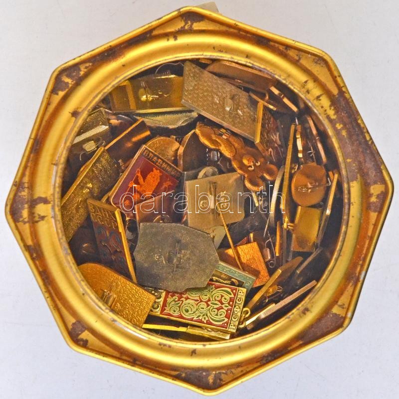 Leírás: Szovjetunió ~1970-1980. Fém teásdoboznyi vegyes jelvény tétel T:vegyes
