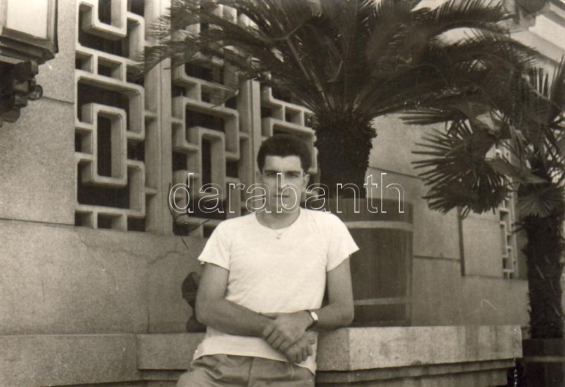 Leírás: 1959 Simon János válogatott kosárlabdázó írása, aláírása 9,5x6,5cm foto hátoldalán
