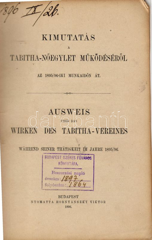 1896 Kimutatás a Tabihta-Nőegylet működéséről; Hornyánszky Viktor nyomdája / Nachweis über das Wirken des Frauenvereins Tabihta; Druckerei von Viktor Hornyánszky