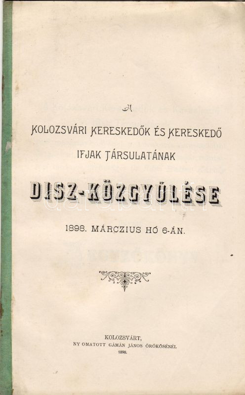 Leírás: 1898 A Kolozsvári Kereskedők és Kereskedő Ifjak Társulatának Dísz-Közgyűlése; Gámán János örököse nyomdája