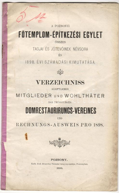 Leírás: 1899 A Pozsonyi Főtemplom Építkezési Egylet tagjai és jótevőinek névsora és kimutatása magyar és német nyelven