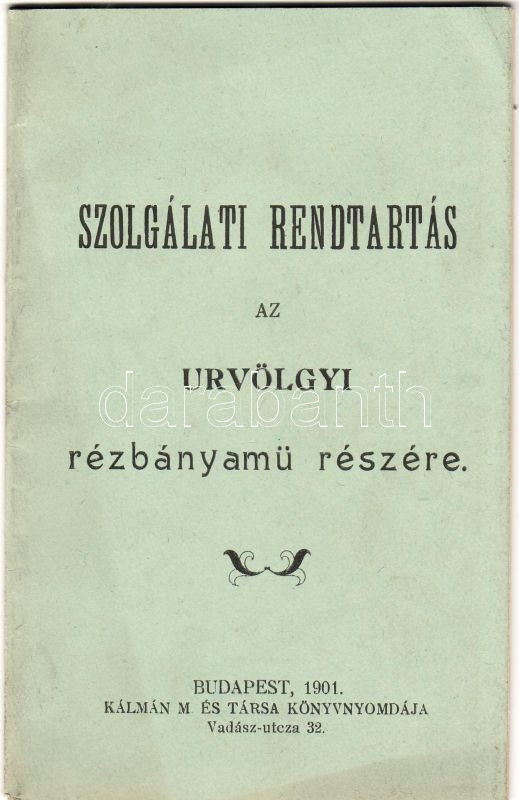 1901 Szolgálati rendtartás az Urvölgyi rézbányamű részére; Kálmán M. é... https://www.darabanth.com/hu/31-Gyorsarveres/31.0/Festmeny-mutargy-papirregiseg-egyeb/Nyomtatvanyok~196/1901-Szolgalati-rendtartas-az-Urvolgyi-rezbanyamu-reszere-Kalman-M-es-tsa-nyomdaja~II59135