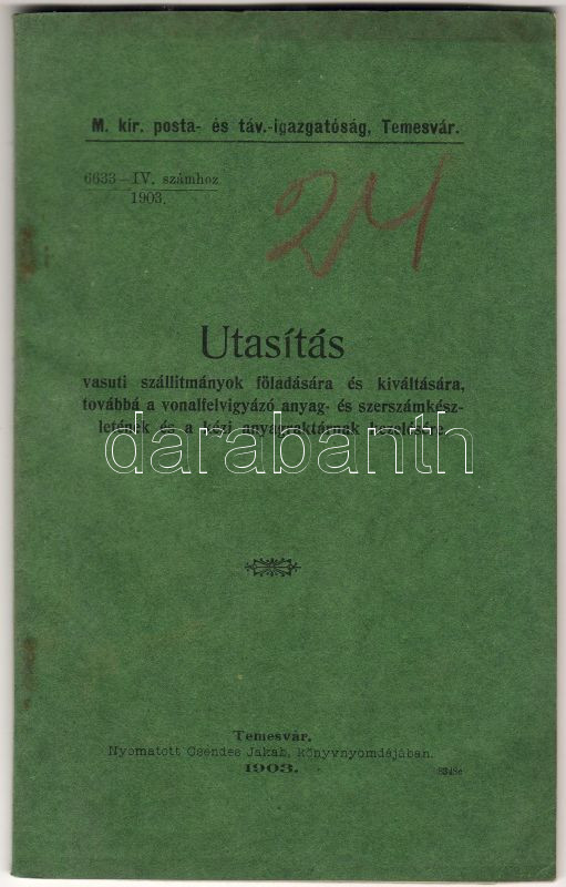 1903 M. kir. posta és táv. igazg. Temesvár: Utasítás vasúti szállitmán... https://www.darabanth.com/hu/31-Gyorsarveres/31.0/Festmeny-mutargy-papirregiseg-egyeb/Nyomtatvanyok~196/1903-M-kir-posta-es-tav-igazg-Temesvar-Utasitas-vasuti-szallitmanyok-foladasara-es-~II59133
