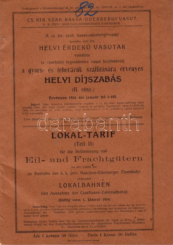 1913 Helyi díjszabás gyors és teheráruk számára a cs. és kir. szab. Kassa-Oederbergi vasúton német és magyar nyelven; Pesti könyvnyomda Rt. / Lokal-Tarif für die Eil- und Frachtgüttern auf der Linien der k. k. priv. Kaschau-Odenberger Eisenbahn auf deutsch und ung.; Pester Druck. AG.