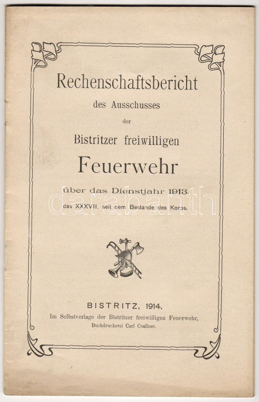 Leírás: 1914 A Besztercei Önkéntes Tűzoltóegylet évi jelentése német nyelven; Carl Csallner nyomdája