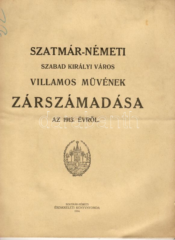 1914 Szatmár-Németi szabad kir. város villamos művénel zárszámadása https://www.darabanth.com/hu/31-Gyorsarveres/31.0/Festmeny-mutargy-papirregiseg-egyeb/Nyomtatvanyok~196/1914-Szatmar-Nemeti-szabad-kir-varos-villamos-muvenel-zarszamadasa~II59126
