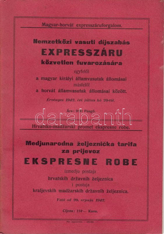 1942 Nemzetközi vasúti díjszabás expresszáru fuvarozására a magyar és horvát vasúton, kétnyelvű nyomtatvány / Internationaler Eisenbahntarif für Expresswaren über die ung. u. croatien Linien, in beiden Sprachen