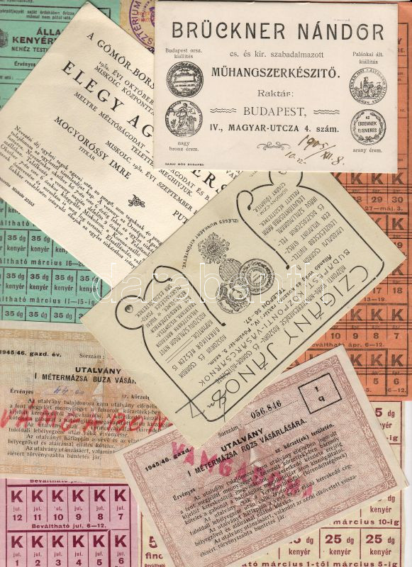 Leírás: Érdekes irattétel 16 klf. (sertés vágási engedély, búza vásárlás, agárverseny, kenyérjegyek, utalványok)