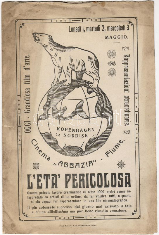 Leírás: cca 1910 A Veszélyes kor c. film ismertető reklámbrossurája és hirdetése a Fiumei Abbazia filmszinházban olasz nyelven