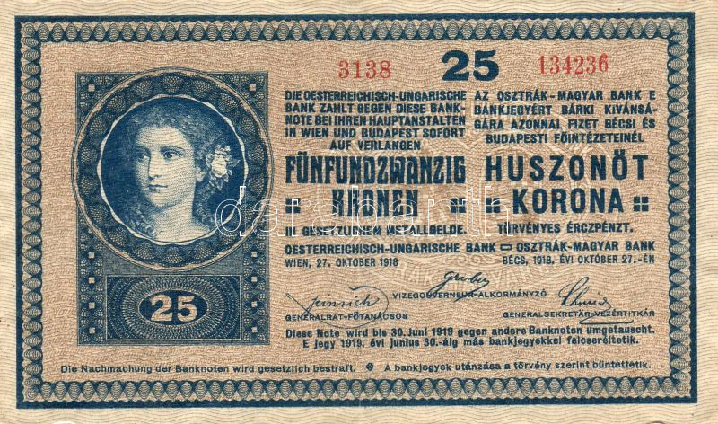 Leírás: 1918. 25K "hullámos hátlap", 3000-en felüli sorszám (magyar kiadás), "K" betűben látványos lemezhiba T:II
